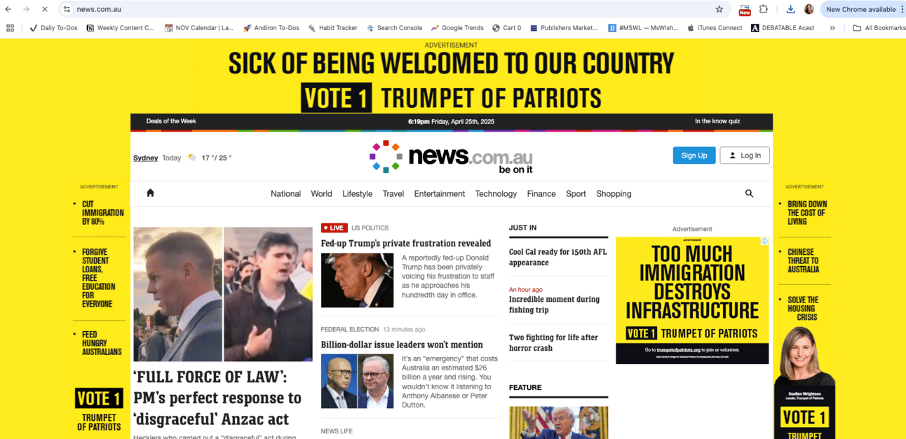 On Anzac Day, while News-dot-com (owned by News Corp) was running headlines like âNeo-Nazi condemned for booing Anzac Day Dawn Serviceâ, it was also running ads by Clive Palmerâs Trumpet of Patriots party with the slogan âSick of being welcomed to our countryâ.