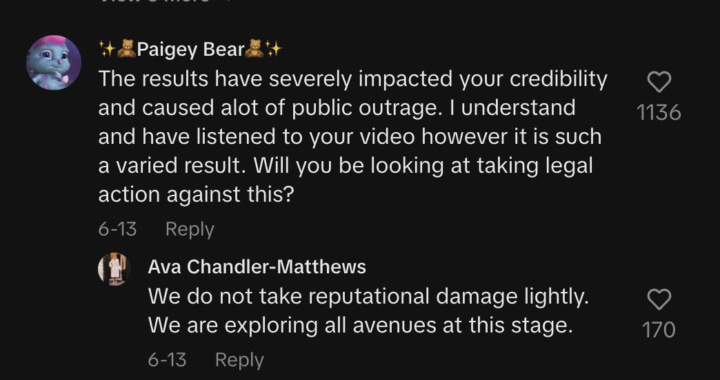 In a response to a TikTok comment asking if Ultra Violette will be taking legal action, Chandler-Matthews replies from her personal account: “We do not take reputational damage lightly. We are exploring all avenues at this stage.”